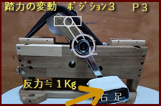 右の足・の重さがペダルにかかり、回転。